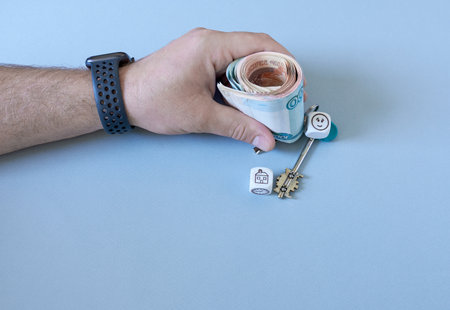 A man's hand holding a key and a roll of money, on a blue background. Concept - buying a house.