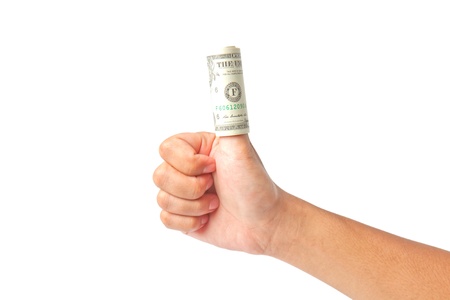 On a black background, a funny hand with an open thumb and a bundle of one hundred dollar bills put on it. Humorous picture with a hand and dollars put on the thumb.