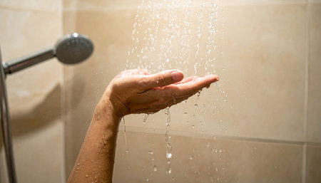 A single hand held out, palm up, to catch falling water from a showerhead in a bathroom.