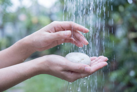 Hands collecting fresh water from a rain shower head in an outdoor setting surrounded by lush green foliage, creating a refreshing and serene atmosphere. ideal for nature-themed designs, wellness promotions, and outdoor lifestyle content. Generative AI