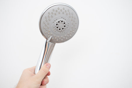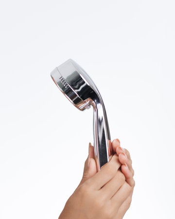 Womans Hand Gripping Modern Chrome Showerhead in Minimalist Setting