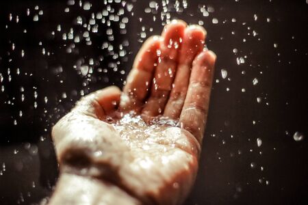 A mans hand in a spray of water in the sunlight against a dark background. Water as a symbol of purity and life