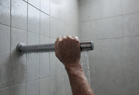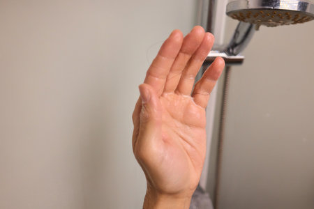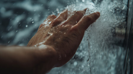 A hand reaching out to adjust the temperature to the coldest setting embracing the challenge of a cold shower