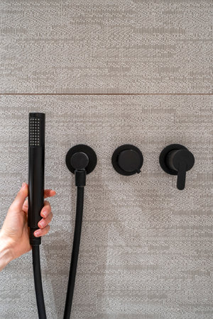 Close up of woman hand holding shower head near modern black water tap against luxury grey textured tile on wall indoors. Detail interior design in apartment bathroom