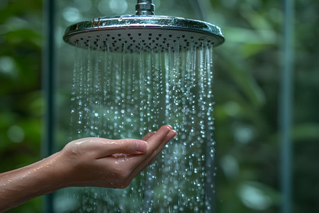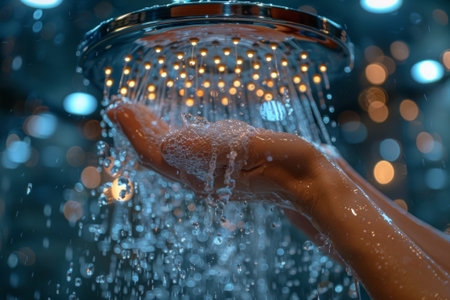 Close-up of a hand under a showerhead with water droplets and bokeh lights. Save water