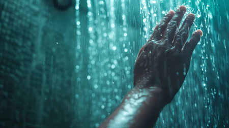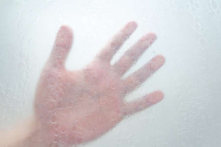 hand through a shower screen with drops on a light background
