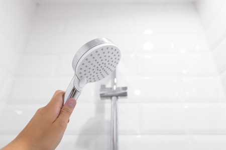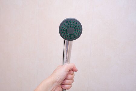 A man hand holding a working shower head concept. Taking a shower in the bathroom concept