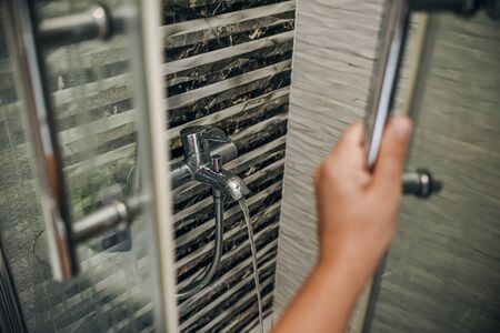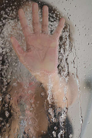 female hand on the glass door of the shower stall. Sensual portrait of young woman taking a shower. Defocused female looks through the glass of the shower stall.