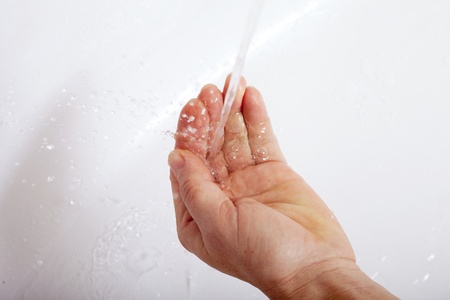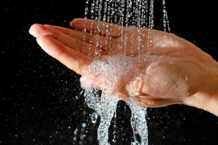 Human hand and faling water