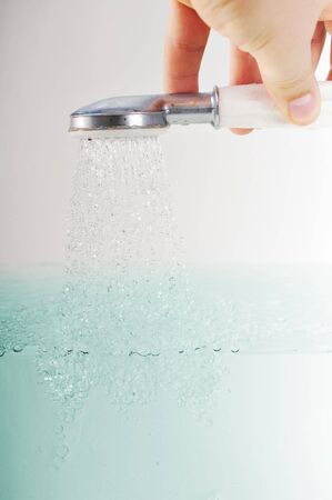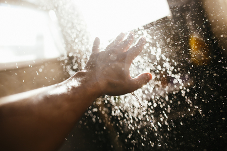 water close up background. Close-up of a man hand check water temperature in the shower with hand shower
