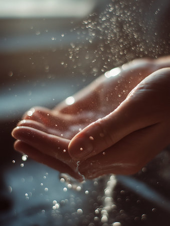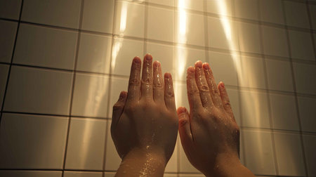 A serene image of wet hands against a tiled wall, capturing droplets and light reflections, evoking feelings of cleanliness, wellness, and relaxation.
