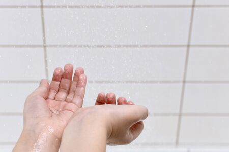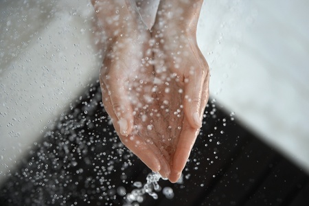 Close up of woman's hands under the rain. Shower concept