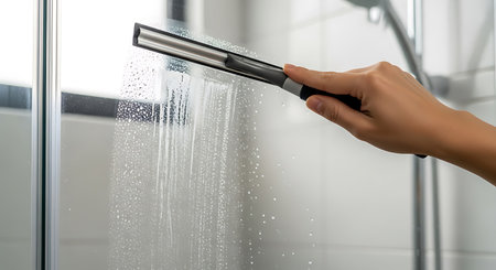 A hand holds a gray and silver squeegee, wiping down a wet glass shower door. Water droplets streak down the glass against a background of white tile.