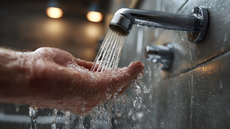 A captivating close-up of a clean hand receiving a gentle stream of water from a sleek faucet in a modern bathroom sink, emphasizing hygiene and comfort.