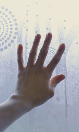 Woman's Hand Held Up Against Steamed Glass. Palm on the moisture mirror
