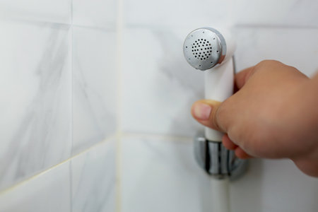 A male plumber repairs the hygienic shower head in the bathroom.