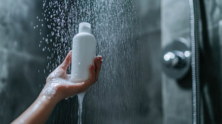 Hand holding a shampoo bottle under running water in a modern shower, emphasizing hydration