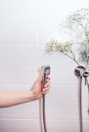 Hygiene and cleanliness concept. New hygienic chrome-plated shower in hand against a background of white tiles. Bathroom