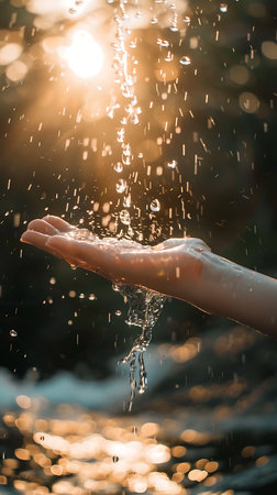 Hands are outstretched, catching soft water droplets in golden sunlight, creating a magical moment.