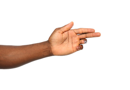 Right Hand of a man act to hold card, mobile phone, tablet PC or other gadget, isolated on white background