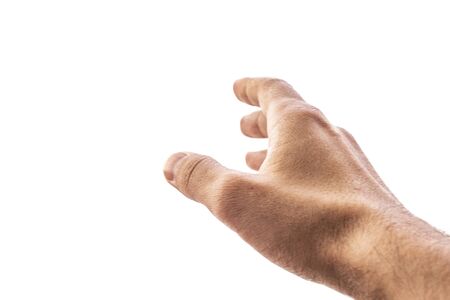 Caucasian male arm opened palm making gesture isolated on white close up front view.