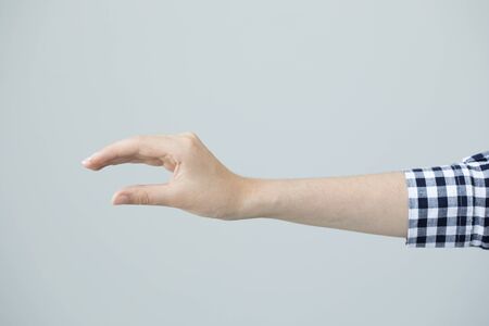 Caucasian female hand gesture or Hand in gesturing with gray background.