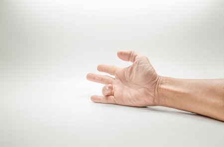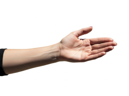 This image features a close-up of a hand with an open palm, isolated on a white background. The hand is positioned with the palm facing forward and fingers slightly spread. The image is clean and minimalistic, making it suitable for various design and educational purposes.