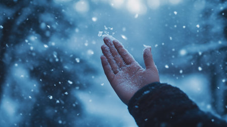 Hand catching falling snowflakes in winter wonderland.