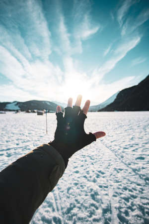 Hand resting on snow, cold and winter, Christmas