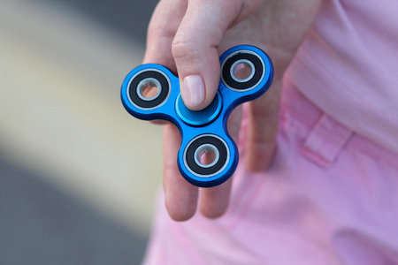 Girl's hand holding a spinning fidget spinner in her hand, spinning them on her index finger