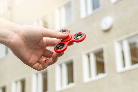 Red hand spinner. Boy playing a popular toy fidget spinner in his hand. Stress relief. Anti stress and relaxation adhd attention fad boy concept.