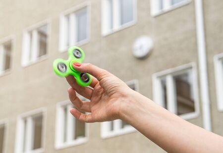 Hand of asian woman spins green fidget spinner. Stress relieving toy.