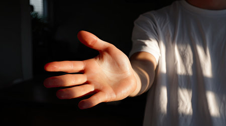 A monochromatic image showing a persons hand reaching forward against a dark backdrop. The interplay of light and shadow emphasizes its texture and form, creating visual interest.