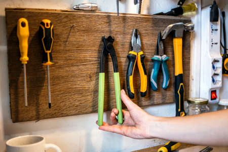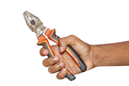 Worker's caucasian male hand holding a plier tool, composition isolated over the white background
