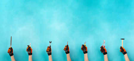 Creative collage with repairmen holding DIY instruments on blue background, blank space. Panorama