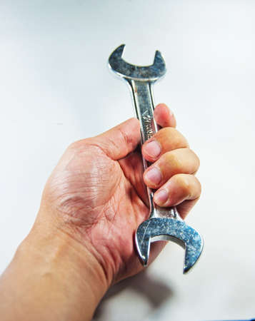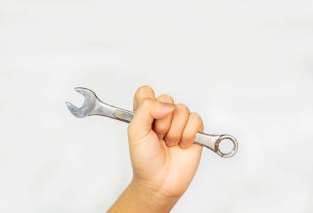 Wrench in hand on a white isolated background. Close up. The concept of repair.