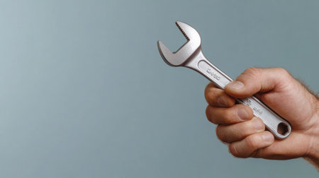 A portrait of a hand of a person or construction worker holding a metal chrome open end wrench tool.