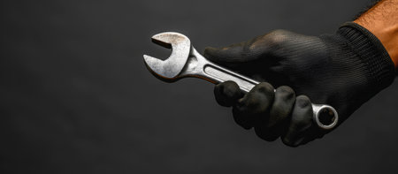 A close-up image of a mechanic's gloved hand holding a spanner tool, symbolizing precision and craftsmanship in a workshop environment. Ideal for themes of repair, maintenance, and engineering.