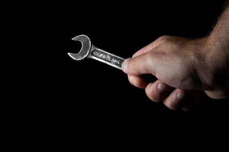 Spanner equipment made of metal. Wrench tool in male hand isolated on white background. Repairer or mechanic hand holds spanner instrument. Maintenance and repairing concept.