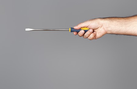 The guy is holding a screwdriver in his hand. Construction tool for screwing screws.