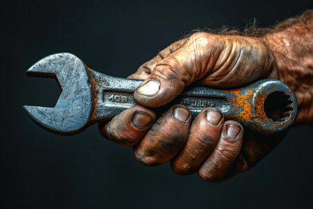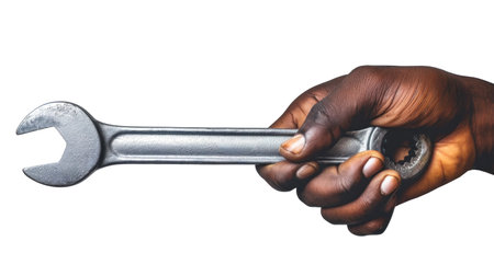 A hand, weathered and strong, grips a wrench against a clean white background.