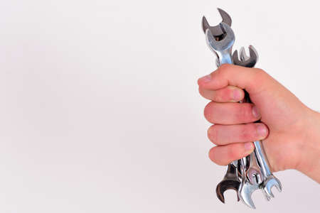 Male hand holds a wrench on a light isolated background. Concept plumber, auto repair, vulcanization. banner.