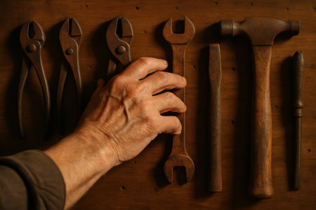 Experienced hand selecting vintage wrench from neatly arranged collection of classic wooden and metal hand tools on rustic workbench.