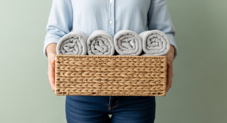 Holding a rectangular woven basket filled with four neatly rolled grey towels, symbolizing cleanliness, comfort, and home organization.