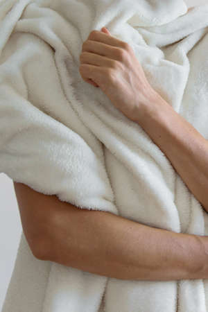 Front close up view of a woman wrapped in a warm white blanket