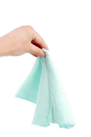 Hand with blue cotton towel.