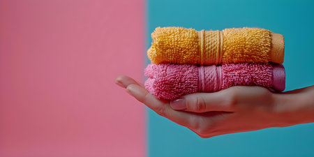 Elegant hand displays colorful towels in serene atmosphere of selfcare scene. Concept Selfcare Scene, Colorful Towels, Serene Atmosphere, Elegant Hand Display, Home Spa Environment