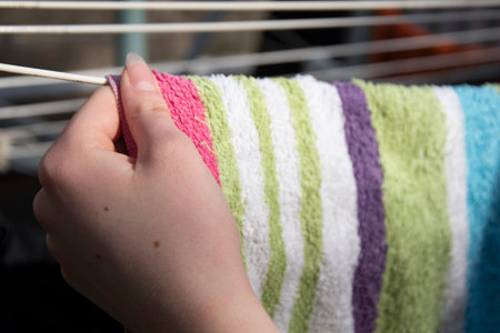 Chores indoors. Hands of a woman folding colorful kitchen towels on a white table near a light blue spray. Cleaning products. House work. Cleaning activities indoors in time of coranavirus disease.