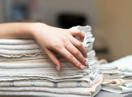 Hotel maid s hands arranging stack of terry towels in a bathroom close up view for interior design