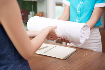 Faceless shot of woman taking white soft towel in roll from spa salon receptionist